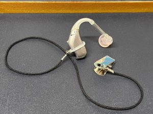 お耳の状態によっては前述②のオーダーメイドの「耳あな型補聴器」が向いていない方や作製できない方などもいます。そんな方にはイヤチェーンという紛失防止用のチェーンを付けることもできます。