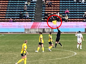 難聴の程度に個人差はあれど、競技中は補聴器などを外してプレーを行うため、通常のサッカーと同じ笛の合図だけでは不十分です。そのため通常のサッカーとは異なり主審もフラッグを持って笛とフラッグの2つの合図で試合をコントロールします。